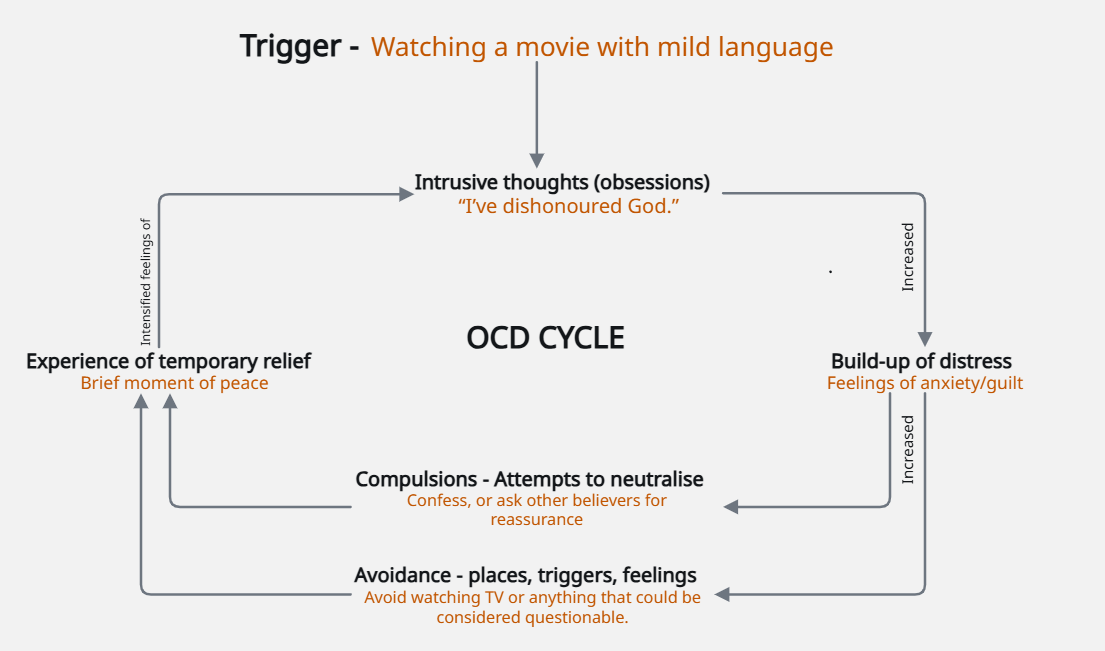 What makes this cycle so distressing is that the very behaviours designed to soothe the anxiety — such as compulsive praying, confessing, seeking reassurance from spiritual leaders, researching to find the correct theological answers, or avoiding certain spiritual practices — actually make the anxiety worse in the long run. Each repetition confirms to the brain that these thoughts must be dangerous, that only ritual or control can make things right. Over time, this pattern becomes deeply entrenched, leading to increased feelings of guilt and self-doubt rather than peace or faithfulness [1,2].